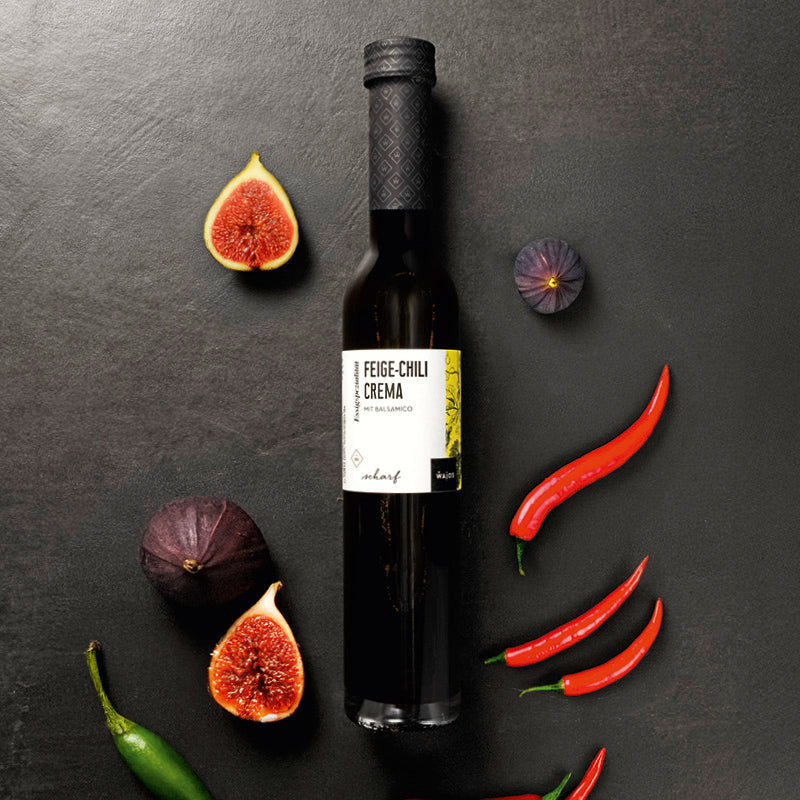 Dla tych, którzy cenią sobie coś wyjątkowego: Nasz krem ​​figowy z chili to harmonijnie zbalansowany produkt na bazie octu, który łączy owocową słodycz z subtelną ostrością – prawdziwy hit w kreatywnej kuchni i pozycja obowiązkowa dla wszystkich smakoszy ceniących jakość i smak. Wyprodukowany z wysokiej jakości octu balsamicznego Aceto Balsamico di Modena i wzbogacony naturalną słodyczą fig z nutą chili, tworzy intensywne doznania smakowe, które zachwycają zarówno na co dzień, jak i na specjalne okazje. Dzięki przyjemnej kwasowości na poziomie 3%, ten specjał idealnie nadaje się do gotowania, grillowania, dopracowywania smaku i eksperymentowania. Czy to jako owocowa nuta w sosie sałatkowym, jako dodatek do grillowanego mięsa, jako dodatek do desek serów, czy jako wyjątkowy akcent do deserów – Krem Figowy z Chili s jest równie wszechstronny, co pyszny. Jego unikalny skład i wysoka jakość produkcji czynią go również atrakcyjną alternatywą dla klasycznego octu balsamicznego, octu chili lub słodkiego octu figowego.